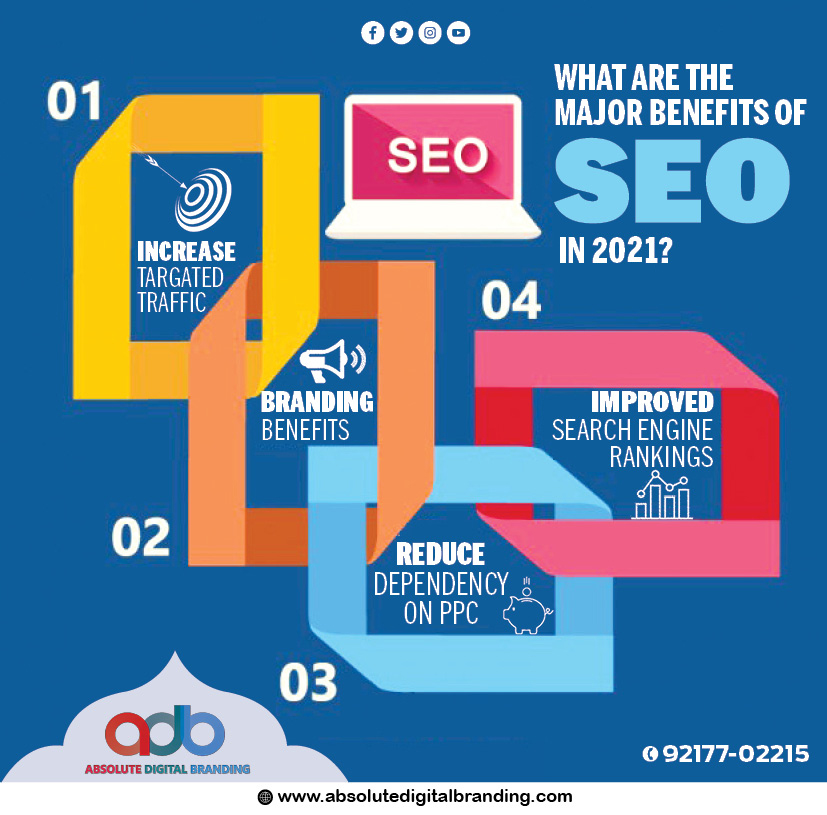 SEO or search engine optimization, the process of improving a website in ways that help it rank in search results when users search for specific words and phrases. SEO also benefits in business by lowering your advertising costs . With a well-planned SEO strategy, your company can rank on the first page of search results for high-value keywords. Build your brand with digital media & take benefit of social media branding contact with Absolute Digital Branding. By Absolutedigitalbranding.com